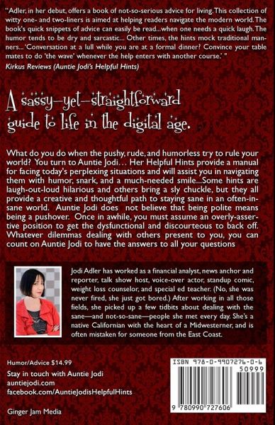 What do you do when the pushy, rude, and humorless try to rule your world? You ask Auntie Jodi. Her Helpful Hints provide a manual for today’s perplexing situations, and assist you in navigating them with humor, snark, and a much-needed smile. Some hints are laugh-out-loud funny, and others provide a polite, thoughtful path. Once in a while, we must err on the side of the "overly assertive" in order to get the obnoxious in our midst to back off. Auntie does not believe that being polite means being a pushover.