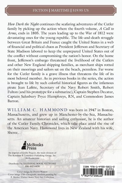 How Dark the Night continues the seafaring adventures of the Cutler family by picking up the action where the fourth volume, A Call to Arms, ends in 1805. The years leading up to the War of 1812 were devastating ones for the young republic. The life-and-death struggle between Great Britain and France caught the United States in a web of financial and political chaos as President Jefferson and Secretary of State Madison labored to keep the unprepared United States out of the conflict without compromising the nation's honor. On the home front, Jefferson's embargo threatened the livelihood of the Cutlers and other New England shipping families as merchant ships rotted on their moorings and sailors sat on the beach, penniless. Far worse for the Cutler family is a grave illness that threatens the life of its most beloved member. As in previous books in the series, the action is brought to life by such colorful historical figures as the infamous pirate Jean Lafitte, Secretary of the Navy Robert Smith, Robert Fulton (and his prototype for a submarine), Captain Stephen Decatur, Captain Salusbury Pryce Humphreys, RN, and Commodore James Barron.