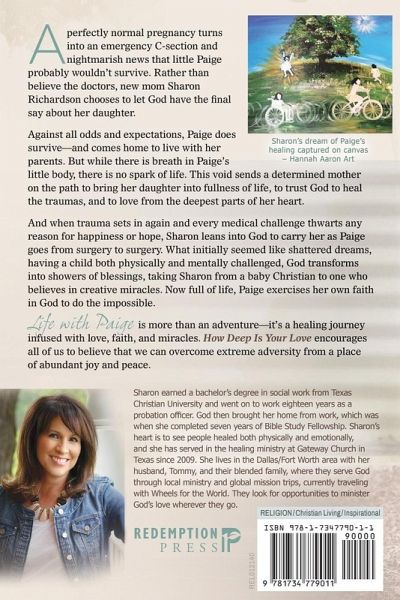 A perfectly normal pregnancy turns into an emergency C-section and nightmarish news that little Paige probably wouldn't survive. Rather than believe the doctors, new mom Sharon Richardson chooses to let God have the final say about her daughter. Against all odd and expectations, Paige does survive-and comes home to live with her parents. But while there is breath in Paige's little body, there is no spark of life. This void sends a determined mother on the path to bring her daughter into fullness of life, to trust God to heal the traumas, and to love from the deepest parts of her heart. And when trauma sets in again and every medical challenge thwarts any reason for happiness or hope, Sharon leans into God to carry her as Paige goes forms surgery to surgery. What initially seemed like shattered dreams, having a child both physically and mentally challenged, God transforms into showers of blessings, taking Sharon from a baby Christian to one who believes in creative miracles. Now full of life, Paige exercises her own faith in God to do the impossible. Life with Paige is more than an adventure-it's a healing journey infused with love, faith, and miracles. How Deep Is Your Love encourages all of us to believe that we can overcome extreme adversity from a place of abundant joy and peace.