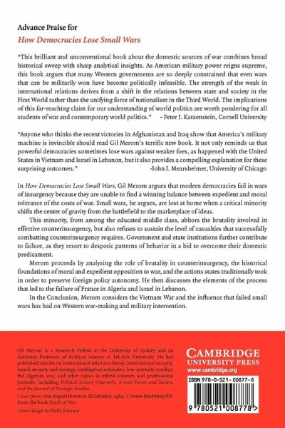 1. Introduction; 2. Military superiority and victory in small wars: historical observations; 3. The structural original of defiance: the middle-class, the marketplace of ideas, and the normative gap; 4. The structural origins of tenacity: national alignment and compartmentalization; 5. The French war in Algeria: a strategic, political, and economic overview; 6. French instrumental dependence and its consequences; 7. The development of a normative difference in France and its consequences; 8. The French struggle to contain the growth of the normative gap and the rise of the 'democratic agenda'; 9. Political relevance and its consequences in France; 10. The Israeli war in Lebanon: a strategic, political, and economic overview; 11. Israeli instrumental dependence and its consequences; 12. The development of a normative difference in Israel and its consequences; 13. The Israeli struggle to contain the growth of the normative gap and the rise of the 'democratic agenda'; 14. Political relevance and its consequences in Israel.