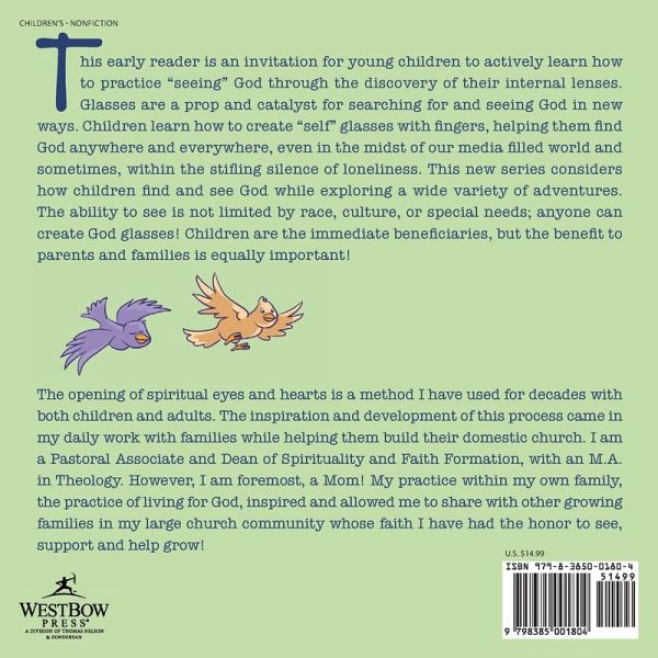 This early reader is an invitation for young children to actively learn how to practice "seeing" God through the discovery of their internal lenses. Glasses are a prop and catalyst for searching for and seeing God in new ways. Children learn how to create "self" glasses with fingers, helping them find God anywhere and everywhere, even in the midst of our media filled world and sometimes, within the stifling silence of loneliness. This new series considers how children find and see God while exploring a wide variety of adventures. The ability to see is not limited by race, culture, or special needs; anyone can create God glasses! Children are the immediate beneficiaries, but the benefit to parents and families is equally important!