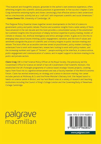 This Palgrave Policy Essential draws together recent developments in the field of science in government, policy and public debate. Practice and academic insights from a wide variety of fields have both moved on in the last decade and this book provides a consolidated survey of the relatively well established but highly scattered set of insights about the provision of deeply technical expertise in policy making (models of climate or disease, risk, Artificial Intelligence and ethics, and so on). It goes on to link this to emerging ideas about futures thinking, public engagement, narrative, and the role of values and sentiment alongside the place of scientific and scholarly insights in public decision-making and debate. The book offers an accessible overview aimed at practitioners; policy-makers looking to understand how to work with researchers, researchers looking to work with policy-makers, and the increasing numbers and types of "brokers" - people working at the interface,in science advice, public engagement and communication of science, and in expert support to decision-making in the public and private sectors. In addition to outlining recent insights and placing them in the established frameworks of authors such as Pielke and Jasanoff, the book also brings in relevant areas less traditionally associated with the subject but of increasing importance, such as modelling, futures and narrative.
