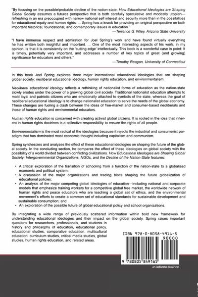 In this book Joel Spring explores three major international educational ideologies that are shaping global society: neo-liberal educational ideology, human rights education, and environmentalism. Neo-liberal ideology reflects a rethinking of nationalist forms of education as the nation-state slowly erodes under the power of a growing global civil society. Traditional nationalist education attempts to mold loyal and patriotic citizens who are emotionally attached to symbols of the state, whereas the goal of neo-liberal educational ideology is to change nationalist education to serve the needs of the global economy. These changes are fueling a clash between the ideas of free-market and consumer-based neo-liberals and those of human rights and environmental educators. Human rights education is concerned with creating activist global citizens. It is rooted in the idea that inherent in human rights doctrines is a collective responsibility to ensure the rights of all people. Environmentalism is the most radical of the ideologies because it rejects the industrial and consumerist paradigm that has dominated most economic thought, including capitalism and communism. Spring synthesizes and analyzes the effect of these educational ideologies on shaping the future of the global society. In the concluding section, he compares the effect of these ideologies on global society with the possibility of a world divided between conflicting civilizations. How Educational Ideologies Are Shaping Global Society: Intergovernmental Organizations, NGOs, and the Decline of the Nation-State features: *a critical exploration of the transition of schooling from a function of the nation-state to a globalized economic and political system; *a discussion of the major organizations and trading blocs shaping the future globalization of educational policies; *an analysis of the major competing global ideologies of education--including national and corporate models that emphasize training workers for a competitive global free market; the worldwide network of human rights and peace educators who are teaching a global set of ethics; and the environmental movement's efforts to create a common set of educational standards for sustainable development and sustainable consumption; and *an exploration of the possible future of global educational policy and school organizations. By integrating a wide range of previously scattered information within a bold new framework for understanding educational ideologies and their impact on the global society, Spring raises important questions for researchers, professionals, and students in history and philosophy of education, educational policy, educational studies, comparative education, multicultural education, curriculum studies, critical media studies, global studies, human rights education, and related areas.