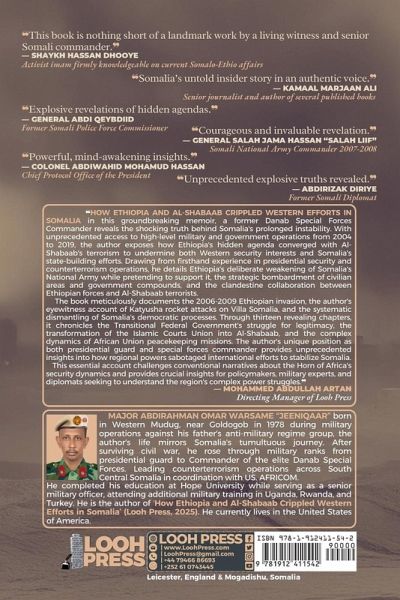 ¿This book is nothing short of a landmark work by a living witness and senior Somali commander.¿ - Shaykh Hassan Dhooye Activist imam firmly knowledgeable on current Ethio-Somali affairs. ¿Somalia's untold insider story in an authentic voice.¿ - Kamaal Marjaan Ali Senior journalist and author of several published books ¿Explosive revelations of hidden agendas.¿ - General Abdi Qeybdiid Former Somali Police Force Commissioner ¿Courageous and invaluable revelation.¿ - General Salah Jama Hassan "Salah Liif" Somali National Army Commander 2007-2008 ¿Powerful, mind-awakening insights.¿ - Colonel Abdiwahid Mohamud Hassan Chief Protocol Office of the President ¿Unprecedented explosive truths revealed.¿ - Abdirizak Diriye Former Somali Diplomat ¿HOW ETHIOPIA AND AL-SHABAAB CRIPPLED WESTERN EFFORTS IN SOMALIA in this groundbreaking memoir, a former Danab Special Forces Commander reveals the shocking truth behind Somalia's prolonged instability. With unprecedented access to high-level military and government operations from 2004 to 2019, the author exposes how Ethiopia's hidden agenda converged with Al-Shabaab's terrorism to undermine both Western security interests and Somalia's state-building efforts. Drawing from firsthand experience in presidential security and counterterrorism operations, he details Ethiopia's deliberate weakening of Somalia's National Army while pretending to support it, the strategic bombardment of civilian areas and government compounds, and the clandestine collaboration between Ethiopian forces and Al-Shabaab terrorists. The book meticulously documents the 2006-2009 Ethiopian invasion, the author's eyewitness account of Katyusha rocket attacks on Villa Somalia, and the systematic dismantling of Somalia's democratic processes. Through thirteen revealing chapters, it chronicles the Transitional Federal Government's struggle for legitimacy, the transformation of the Islamic Courts Union into Al-Shabaab, and the complex dynamics of African Union peacekeeping missions.¿ - Mohammed Abdullah Artan Directing Manager of Looh Press MAJOR ABDIRAHMAN OMAR WARSAME "JEENIQAAR" born in Western Mudug, near Goldogob in 1978 during military operations against his father's anti-military regime group, the author's life mirrors Somalia's tumultuous journey. After surviving civil war, he rose through military ranks from presidential guard to Commander of the elite Danab Special Forces. Leading counterterrorism operations across South Central Somalia in coordination with US. AFRICOM. He completed his education at Hope University while serving as a senior military officer, attending additional military training in Uganda, Rwanda, and Turkey. He currently lives in the United States of America.