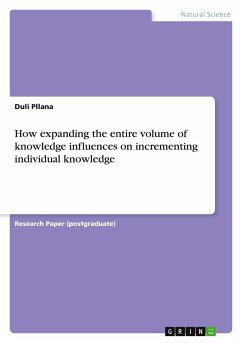 Research Paper (postgraduate) from the year 2018 in the subject Biology - Neurobiology, grade: 2.5, , language: English, abstract: The paper deals with the question how you can increment individual knowledge. In general, people chase knowledge tending to know the entire knowledge; nevertheless, they set one step forward and two steps backward. The development of knowledge grows exponentially; recently knowledge doubles every year - very soon is predict it is going to double every twelve hours. There are many researchers who deals with body volume of knowledge, and what percentage of entire knowledge are able to know specialist researchers. In a broad-spectrum people are eager to know the development of knowledge; likewise, how much they know in their favorite field or occupation; as a result, they test their knowledge in different ways. Usually, students or test takers are assessed by others on the test. Nonetheless, majority of test takers check their knowledge on their own before they take any test. Another way assessing knowledge is by getting feedback from others. The key question remains, do test takers/learners get the accurate assessment on their knowledge? Most likely the evaluation might be inaccurate on inspecting the knowledge in a specific field. Test givers are subjective in their decisions, teachers are too generous with giving a positive feedback, and assessing your own work is biased. Assessing your own knowledge is impossible because people inflate their evaluation or deflate. Furthermore, the paper deals with the question are children smarter than parents. The outcome will reveal the evidence of correlation between the entire and individual knowledge. Above all, Individual knowledge is relative since it depends on the development of entire knowledge.