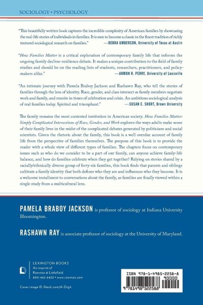 The family remains the most contested institution in American society. How Families Matter: Simply Complicated Intersections of Race, Gender, and Work explores the ways adults make sense of their family lives in the midst of the complicated debates generated by politicians and social scientists. Given the rhetoric about the family, this book is a well overdue account of family life from the perspective of families themselves. The purpose of this book is to provide the reader with a whole view of different types of families. The chapters focus on contemporary issues such as who do we consider to be a part of our family, can anyone achieve family-life balance, and how do families celebrate when they get together? Relying on stories shared by a racially/ethnically diverse group of forty-six families, this book finds that parents and siblings cultivate a family identity that both defines who they are and influences who they become. It is a welcomed installment to conversations about the family, as families are finally viewed within a single study from a multicultural lens.