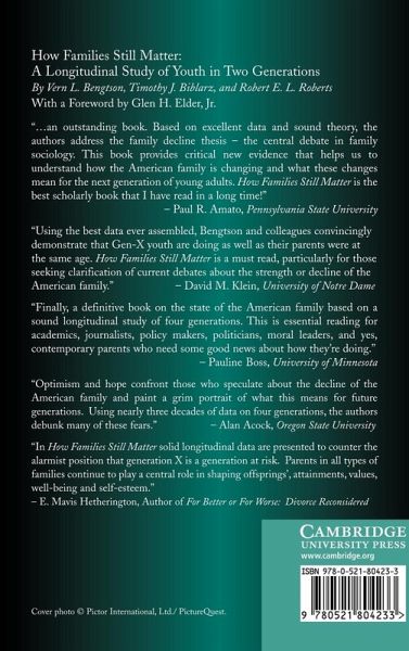 How Families Still Matter casts doubt on the conventional wisdom about family decline during the last decades of the twentieth century. The authors draw from the longest-running longitudinal study of families in the world - the Longitudinal Study of Generations, conducted at the University of Southern California - to discover whether parents are really less critical in shaping the life choices and achievements of their children than they were a generation ago. They compare the influence of parents (on self-confidence, values, and levels of achievement) on the Baby Boomer generation with that of Baby-Boomer parents on their own Generation-X children. The findings may surprise many readers. Generation-X youth showed higher levels of education, career attainments, and self-esteem than their parents as youth, and similar values were found across generations. They indicate the 'resilience' of family bonds across generations even against the backdrop of massive social and family changes since the 1960s.