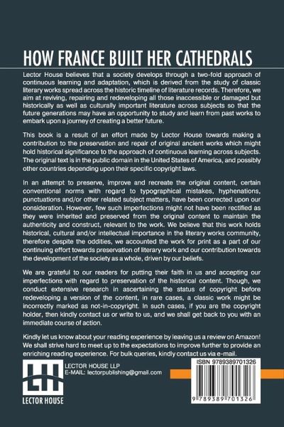 How France Built Her Cathedrals: A Study In The Twelfth And Thirteenth Centuries This book is a result of an effort made by us towards making a contribution to the preservation and repair of original classic literature. In an attempt to preserve, improve and recreate the original content, we have worked towards: 1. Type-setting & Reformatting: The complete work has been re-designed via professional layout, formatting and type-setting tools to re-create the same edition with rich typography, graphics, high quality images, and table elements, giving our readers the feel of holding a 'fresh and newly' reprinted and/or revised edition, as opposed to other scanned & printed (Optical Character Recognition - OCR) reproductions. 2. Correction of imperfections: As the work was re-created from the scratch, therefore, it was vetted to rectify certain conventional norms with regard to typographical mistakes, hyphenations, punctuations, blurred images, missing content/pages, and/or other related subject matters, upon our consideration. Every attempt was made to rectify the imperfections related to omitted constructs in the original edition via other references. However, a few of such imperfections which could not be rectified due to intentional\unintentional omission of content in the original edition, were inherited and preserved from the original work to maintain the authenticity and construct, relevant to the work. We believe that this work holds historical, cultural and/or intellectual importance in the literary works community, therefore despite the oddities, we accounted the work for print as a part of our continuing effort towards preservation of literary work and our contribution towards the development of the society as a whole, driven by our beliefs. We are grateful to our readers for putting their faith in us and accepting our imperfections with regard to preservation of the historical content. HAPPY READING!