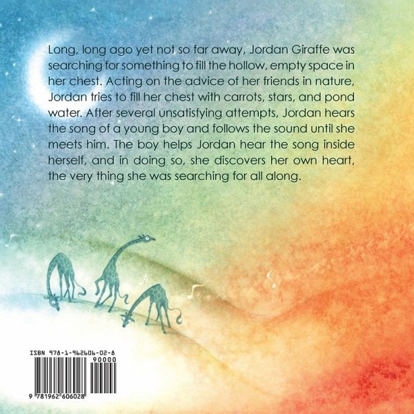 Long, long ago yet not so far away, Jordan Giraffe was searching for something to fill the hollow, empty space in her chest. Acting on the advice of her friends in nature, Jordan tries to fill her chest with carrots, stars, and pond water. After several unsatisfying attempts, Jordan hears the song of a young boy and follows the sound until she meets him. The boy helps Jordan hear the song inside herself, and in doing so, she discovers her own heart, the very thing she was searching for all along. From the Author: Giraffe Tales is a series of beautifully illustrated children's picture story books. Giraffes, one of the land animals with the largest hearts, are sometimes referred to as symbols of Nonviolent Communication since our hearts are where we hold the feelings and needs we most cherish. How Giraffe's Found Their Hearts is a story of the importance of being connected to our own hearts so we can live from our own values and joy. In How the Giraffe's Got Their Ears, the giraffes find joy when they are able to hear the beautiful feelings and needs in all hearts, in other words, when they are able to empathize with each other. Back matter includes discussion prompts and an activity.