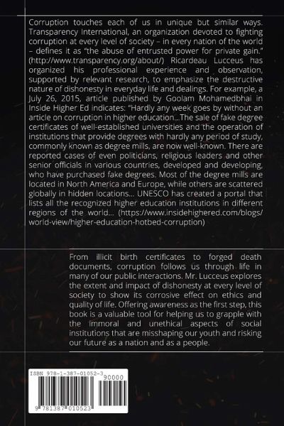 Corruption touches each of us in unique but similar ways. Transparency International, an organization devoted to fighting corruption at every level of society - in every nation of the world - defines it as "the abuse of entrusted power for private gain." (http://www.transparency.org/about/) Ricardeau Lucceus has organized his professional experience and observation, supported by relevant research, to emphasize the destructive nature of dishonesty in everyday life and dealings. From illicit birth certificates to forged death documents, corruption follows us through life in many of our public interactions. Mr. Lucceus explores the extent and impact of dishonesty at every level of society to show its corrosive effect on ethics and quality of life. Offering awareness as the first step, this book is a valuable tool for helping us to grapple with the immoral and unethical aspects of social institutions that are misshaping our youth and risking our future as a nation and as a people.