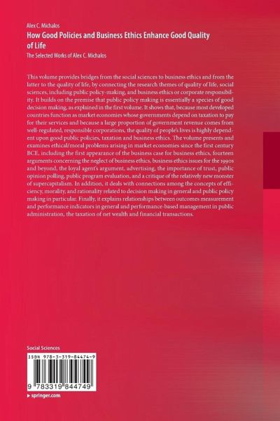 This volume provides bridges from the social sciences to business ethics and from the latter to the quality of life, by connecting the research themes of quality of life, social sciences, including public policy-making, and business ethics or corporate responsibility. It builds on the premise that public policy making is essentially a species of good decision making, as explained in the first volume. It shows that, because most developed countries function as market economies whose governments depend on taxation to pay for their services and because a large proportion of government revenue comes from well-regulated, responsible corporations, the quality of people's lives is highly dependent upon good public policies, taxation and business ethics. The volume presents and examines ethical/moral problems arising in market economies since the first century BCE, including the first appearance of the business case for business ethics, fourteen arguments concerning the neglect of business ethics, business ethics issues for the 1990s and beyond, the loyal agent's argument, advertising, the importance of trust, public opinion polling, public program evaluation, and a critique of the relatively new monster of super-capitalism. In addition, it deals with connections among the concepts of efficiency, morality, and rationality related to decision making in general and public policy making in particular. Finally, it explains relationships between outcomes measurement and performance indicators in general and performance-based management in public administration, the taxation of net wealth and financial transactions.