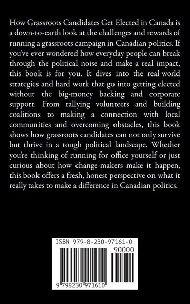 How Grassroots Candidates Get Elected in Canada is a down-to-earth look at the challenges and rewards of running a grassroots campaign in Canadian politics. If you've ever wondered how everyday people can break through the political noise and make a real impact, this book is for you. It dives into the real-world strategies and hard work that go into getting elected without the big-money backing and corporate support. From rallying volunteers and building coalitions to making a connection with local communities and overcoming obstacles, this book shows how grassroots candidates can not only survive but thrive in a tough political landscape. Whether you're thinking of running for office yourself or just curious about how change-makers make it happen, this book offers a fresh, honest perspective on what it really takes to make a difference in Canadian politics.