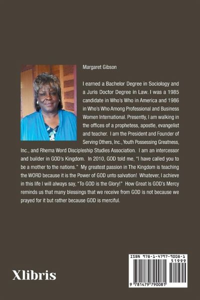 I earned a Bachelor Degree in Sociology and a Juris Doctor Degree in Law. I was a 1985 candidate in Who's Who in America and 1986 in Who's Who Among Professional and Business Women International. Presently, I am walking in the offices of a prophetess, apostle, evangelist and teacher. I am the President and Founder of Serving Others, Inc., Youth Possessing Greatness, Inc., and Rhema Word Discipleship Studies Association. I am an intercessor and builder in GOD's Kingdom. In 2010, GOD told me, "I have called you to be a mother to the nations." My greatest passion in The Kingdom is teaching the WORD because it is the Power of GOD unto salvation! Whatever, I achieve in this life I will always say, "To GOD is the Glory!" How Great Is GOD's Mercy reminds us that many blessings that we receive from GOD is not because we prayed for it but rather because GOD is merciful.