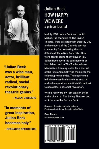 In July 1957 Julian Beck and Judith Malina, the founders of The Living Theatre, were arrested with Dorothy Day and members of the Catholic Worker community for protesting the civil defense drills in New York City. They were sentenced to thirty days in jail. Julian Beck spent his confinement on Hart Island and in The Tombs in lower Manhattan, keeping notes for a journal at the time and amplifying them over the following two months. The experience led him to examine his role as an artist and subsequently commit his life and art to nonviolent anarchist revolution.