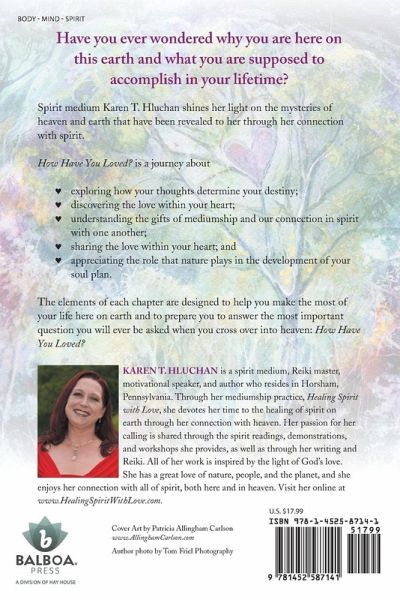 Have you ever wondered why you are here on this earth and what you are supposed to accomplish in your lifetime? Spirit medium Karen T. Hluchan shines her light on the mysteries of heaven and earth that have been revealed to her through her connection with spirit. How Have You Loved? is a journey about ¿ exploring how your thoughts determine your destiny; ¿ discovering the love within your heart; ¿ understanding the gifts of mediumship and our connection in spirit with one another; ¿ sharing the love within your heart; and ¿ appreciating the role that nature plays in the development of your soul plan. The elements of each chapter are designed to help you make the most of your life here on earth and to prepare you to answer the most important question you will ever be asked when you cross over into heaven: How Have You Loved?