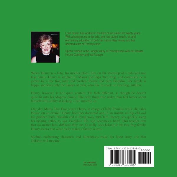 This is the sweet story of a little boy adopted by a family of red-eyed tree frogs. Mama and Papa Tree Frog, Flossie, and Baby Franklin are his adorable tree frog family. Though Henry knows he is loved, he feels out of place. He doesn't enjoy the same games or food as his tree frog family. Papa Tree Frog has to build him a special level on their tree house, as Henry doesn't climb as well as the others. The only thing that Henry does expertly is kicking a ball into the air. One day Mama Tree Frog leaves Henry in charge of Franklin while she takes Flossie on an errand. Henry becomes distracted, and in an instant a big old owl has grabbed Franklin and is flying away. How Henry saves Franklin's life and becomes a hero is exciting and inspiring. Through the experience he learns that he truly does belong to his family, and that no matter what their differences, what makes a family is love.