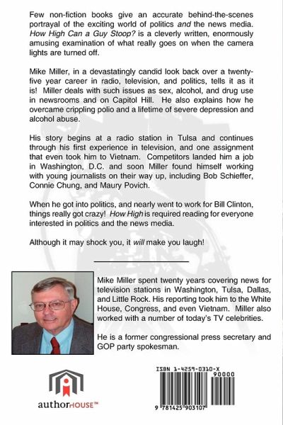 Few non-fiction books give an accurate behind-the-scenes portrayal of the exciting world of politics and the news media. How High Can a Guy Stoop? is a cleverly written, enormously amusing examination of what really goes on when the camera lights are turned off. Mike Miller, in a devastatingly candid look back over a twenty-five year career in radio, television, and politics, tells it as it is! Miller deals with such issues as sex, alcohol, and drug use in newsrooms and on Capitol Hill. He also explains how he overcame crippling polio and a lifetime of severe depression and alcohol abuse. His story begins at a radio station in Tulsa and continues through his first experience in television, and one assignment that even took him to Vietnam. Competitors landed him a job in Washington, D.C. and soon Miller found himself working with young journalists on their way up, including Bob Schieffer, Connie Chung, and Maury Povich. When he got into politics, and nearly went to work for Bill Clinton, things really got crazy! How High is required reading for everyone interested in politics and the news media. Although it may shock you, it will make you laugh!