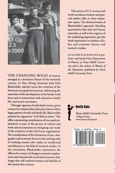 As the twentieth century draws to an end, the changing role of women appears as one of the dominant features of the era. In Now Hiring, historian Julia Blackwelder traces the century-long evolution of the American occupational structure and the ensuing rise in demand for female workers through the closing episodes of the Industrial Revolution and the advent of postindustrialism. Decade by decade, she adroitly traces the main lines of the development of the female work force and its interactions with education, family life, and social convention while developing a nuanced analysis of the differential patterns for various ethnic, racial, age, and socioeconomic groups. Through vignettes of individual women, given context by statistical data that place them within larger patterns of work and family life, Blackwelder presents her arguments "with flesh on them." She offers a pioneering consideration of non-paid employment as part of the picture of women and work and incorporates an intriguing case study of the evolution of the Girl Scout organization. Her consideration of the interaction of race, class, gender, and economic forces in the evolving roles of working women--particularly since she weaves these issues into every discussion, rather than isolating them as afterthoughts--also makes an intellectual contribution to the field of women's studies. In her conclusion, Blackwelder summarizes the effects of a century of change in women's employment and delineates the social and economic challenges that will confront women and families of the twenty-first century. Blackwelder portrays the larger economy as the premier driving force for patterns of female work. She demonstrates that the reconfiguration of the women's labor market followed the shift of the leading sector, from agriculture in the nineteenth century to manufacturing and eventually to service industries. In addition, she shows how changes in the labor market redirected female education and transformed family structures in the United States and how these changes in turn contributed to the further restructuring of job opportunities and salary structures. Blackwelder analyzes how gender conventions have affected the employment of women: what industries would hire them, what positions they were considered for, what pay was considered appropriate. Considering how the shift in the national economy and the growing female permeation of the labor force changed the dynamics and economics of family life, she shows that although wage-earning wives gained more authority within marriage, they also assumed heavier responsibilities for the financial support of their families. As rising rates of separation and divorce further burdened mothers (who generally had child custody), women's economic advances paradoxically worsened their overall financial well-being. This survey of U.S. women and work introduces students and general readers alike to these important topics, and the distinctiveness of Blackwelder's approach, blending quantitative data and oral history materials, as well as the cogency of her underlying arguments, give the book importance to scholars of labor and economic history and women's studies.