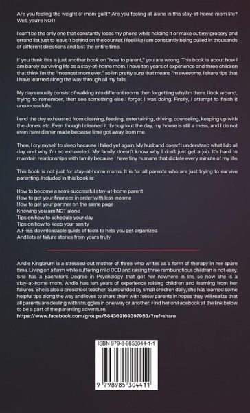 Feeling the weight of mom guilt? Feeling all alone in this stay-at-home-mom life? Well, you're NOT! I can't be the only one that constantly loses my phone while holding it, or make out my grocery and errand list just to leave it behind on the counter. I feel like I am constantly being pulled in thousands of different directions and lost the entire time. If you think this is just another book on "how to parent" you are wrong. This book is about how I am barely surviving life as a stay-at-home mom. I have ten years of experience and three children that think I'm the "meanest mom ever" so I'm pretty sure that means I'm awesome. I share tips that I have learned along the way through all my failures. My days usually consist of walking into different rooms then forgetting why I'm there. I look around trying to remember then see something else I forgot I was doing so, I attempt to finish it unsuccessfully. I end the day exhausted from cleaning, feeding, entertaining, driving, counseling, keeping up with the Jones, etc. My house is still a mess even though I cleaned it throughout the day, and dinner is not even made because time got away from me. Then, I cry myself to sleep because I failed yet again. My husband doesn't understand what I do all day and why I'm so exhausted. My family doesn't understand why I don't just get a job. It's hard maintaining relationships with extended family because I have tiny humans that dictate every minute of my life. This book is not just for stay-at-home moms. It is for all parents who are just trying to survive parenting. Included in this book is:How to become a semi-successful stay-at-home parent How to get your finances in order with less income How to get your partner on the same page Knowing you are NOT alone Tips on how to schedule your day Tips on how to keep your sanity A FREE downloadable guide of tools to help you get organized And lots of failure stories from yours truly So click "Add to cart" and join me in trying to survive the mayhem of parenthood!