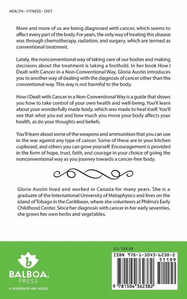 More and more of us are being diagnosed with cancer, which seems to affect every part of the body. For years, the only way of treating this disease was through chemotherapy, radiation, and surgery, which are termed as conventional treatment. Lately, the nonconventional way of taking care of our bodies and making decisions about the treatment is taking a foothold. In her book How I Dealt with Cancer in a Non-Conventional Way, Gloria Austin introduces you to another way of dealing with the diagnosis of cancer other than the conventional way. This way is not harmful to the body. How I Dealt with Cancer in a Non-Conventional Way is a guide that shows you how to take control of your own health and well-being. You'll learn about your wonderfully made body, which was made to heal itself. You'll see that what you eat and how much you move your body affects your health, as do your thoughts and beliefs. You'll learn about some of the weapons and ammunition that you can use in the war against any type of cancer. Some of these are in your kitchen cupboard, and others you can grow yourself. Encouragement is provided in the form of hope, trust, faith, and courage in your choice of going the nonconventional way as you journey towards a cancer-free body.