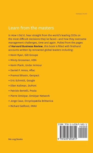 Powerful stories from the world's top CEOs to help prepare you for the hard decisions ahead. The essays in How I Did It teach and inspire. Pulled directly from the pages of one of the most popular columns in Harvard Business Review, these essays offer firsthand accounts of the most difficult management challenges faced by the men and women who occupy the corner office. It's the next best thing to sitting down and talking face-to-face with these corporate leaders. You'll hear from renowned global leaders including: * Kevin Ryan, Gilt Groupe * Mindy Grossman, HSN * Kevin Plank, Under Armour * Daniel P. Amos, Aflac * Pramod Bhasin, Genpact * Eric Schmidt, Google * Ellen Kullman, DuPont * Patrizio Bertelli, Prada * Pierre Omidyar, Omidyar Network * Jorge Cauz, Encyclopaedia Brittanica * Richard Gelfond, IMAX Let these potent stories of strategic thinking-and often bold and unconventional action-be your guide as you step into your own future as a leader.
