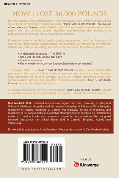 Do you struggle with a weight problem? Are you disappointed with low calorie and fad diets? In the revolutionary weight loss guide How I Lost 36,000 Pounds: Real Cause of and Cure for Obesity, author Mel Anchell, M.D. advocates a re-education of the person with the clinically proven, healthful, non-starvation diet resulting in a permanent normal weight without debilitating exercise. Dr. Anchell draws on verified, scientific obesity research and more than forty years of real clinical observations substantiating this research with thousands of everyday patients in a real clinical setting. He shares his findings on the following topics: Understanding obesity-The TRUTH The Real Obesity Cause and Cure Practical concerns The cholesterol craze-an Expose' [absolute must reading] The dietary TRUTHS in How I Lost 36,000 Pounds results in normal and healthy permanent body weight. Caloric intake or exercise are not the answer. However, those not under the personal physical care of Dr. Anchell should not regard any communication from him, including the information contained in How I Lost 36,000 Pounds, as a doctor-patient discussion. An obesity textbook for laymen and physicians. How I Lost 36,000 Pounds is based on scientific obesity facts substantiated by repeated, critical clinical observations.