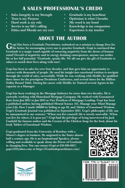 Gopi Has been a Gratitude Practitioner, embarked on a mission to change lives for the better, by encouraging every one to practice Gratitude. Gopi is convinced that Gratitude is a magic wand capable of removing negativity from the shores of human mind! Devoid of negativity and its energy draining consequences, anyone can realize his or her full potential. "Gratitude, speaks life. We all can give the gift of Gratitude to others to enrich their lives along with ours!Gopi has been in sales for over four decades, and that gave him an opportunity to interact with thousands of people. He used his insight into emotional wisdom to navigate through the world of sales, successfully. While he was working with Metlife, he qualified three times for the prestigious Presidents Conference, and several times for the Million Dollar Round Table. During his career with Metlife, he Trained several Agents in his capacity as a Manager.Gopi has been working in the Mortgage Industry for more than two decades. He is currently working with Homeland Mortgage Company. He worked with Guaranteed Rate from Jan 2021 to Jan 2023 as Vice President of Mortgage Lending. Gopi has been a published author, having published Mental Science 101, Manage your Mind Manage your Life, How I made 500000 in Selling at age 69, and Tablets of Emotional Wisdom. Gopi's Gratitude Journal was published in September 2021. Gopi's philosophy of life can be summarized in one sentence "When you live yourself, life is utterly miserable. When you live for others, it is pure joy"! Gopi had the privilege of being interviewed by Jack Canfield the famous author and the Creator of the Chicken Soup for the Soul, about his book Tablets of Emotional Wisdom.Gopi graduated from the University of Bombay with a Master's degree in business. He migrated to the States almost half a century ago. He is an Inspirational Speaker, always willing and available to speak about the Power of Gratitude in changing lives. You can contact Gopi at 630-290-6847, gopi132@yahoo.com or https://Gratitudepractitioner.com/.