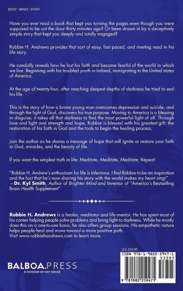 Have you ever read a book that kept you turning the pages even though you were supposed to be out the door thirty minutes ago? Or been drawn in by a deceptively simple story that kept you deeply and totally engaged? Robbie H. Andrews provides that sort of easy, fast paced, and riveting read in his life story. He candidly reveals how he lost his faith and became fearful of the world in which we live. Beginning with his troubled youth in Ireland, immigrating to the United states of America. At the age of twenty-four, after reaching deepest depths of darkness he tried to end his life. This is the story of how a brave young man overcomes depression and suicide, and through the light of God, discovers his true purpose. Moving to America is a blessing in disguise; it takes all that darkness to find the most powerful light of all. Through love and light and strength and hope, Robbie is blessed with his greatest gift: the restoration of his faith in God and the tools to begin the healing process. Join the author as he shares a message of hope that will ignite or restore your faith in God, miracles, and the beauty of life. If you want the simplest truth in life: Meditate, Meditate, Meditate; Repeat! "Robbie H. Andrew's enthusiasm for life is infectious. I find Robbie to be an inspiration and the fact that he's now sharing his story with the world makes my heart sing!" -Dr. Kyl Smith, Author of Brighter Mind and Inventor of "America's Bestselling Brain Health Supplement"