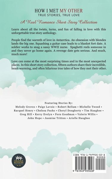Learn about all the twists, turns, and fun of falling in love with this unforgettable true story anthology. People find the warmth of love in Antarctica. An obsession with blondes lands the big one. Squashing a guitar case leads to a blanket fort date. A soldier works to snag a sassy WWII nurse. A revenge date gets serious. Spaghetti reels someone in and they never go home again. And much, much more! Love can come at the most surprising times and in the most unexpected places. In this short story collection, fifteen authors share their incredible, heart-warming, and often hilarious true tales of how they met their other. **A Closer Look into Some of the Stories** A Rose Frozen in Time, by Michelle Tweed - In the constant darkness and cold of Antarctica, Michelle is busy with work at McMurdo Station and doesn't have time for any distractions. That is until she meets Brandon and the two go on a beautiful journey among the snow-covered volcanoes and crystallized ice formations. Love in Marabella, by Racquel Henry - Michael knows exactly what he wants, one of the beautiful Revanales sisters, Deborah. But in their religious culture in Trinidad, he is not allowed to date her. He soon devises a plan to have Deborah work for him and hopes that her disapproving mother won't keep them apart. Michael must figure out how to woo Deborah and make her his while facing mounting opposition. Cute Hat Boy and the Weird Girl - Paige has always thought of herself as awkward, but never more so when she sits on the cute boy's guitar case, crushing his instrument. Somehow the pair still connect and he invites her over to try artichokes, a food Paige has never eaten and is sure to make a fool of her, again. Paige must figure out how to play it cool but still be herself when the date progresses to its grand finale: blanket forts. Eddie and Me, by Bob Bellam - After a crushing heartbreak, Bob is determined never to commit to another man so easily again. But then the sun shines down on a gorgeous man on a cruise ship and Bob is drawn like a magnet. Eddie is fun, smart, and caring and spends months showing Bob how deeply he feels for him. When a sudden medical emergency stops Bob in his tracks, he is forced to confront what really matters in his life. All I Did Was Open the Door, by Melody Groves - Blonds. Melody's obsession takes center stage while she is living on base overseas, enjoying the plethora of soldiers. Then the perfect blond man walks through her door and she will do whatever it takes to have him as her own, shoving aside all the competition. In the Cards, by Cheryl Dougherty - After losing her beloved husband, Cheryl thinks she will never want another man again. When her support group starts dating online, she initially thinks it's a dangerous idea, but when she finds herself missing companionship she gives it a shot. She's in for a big surprise when she realizes who is her best match. Never Feed Spaghetti to a Stray, by Valerie Willis - Valerie is sick of guys who aren't interested in the real thing when Justin stumbles into her life. She offers him spaghetti and he loves it so much he doesn't go home that night. In fact, he keeps coming back for more every night. But what does all that mean? Is it real love? Amazing Grace, by John Hope - Bud wakes up in a military hospital to find himself under the care of sassy nurse, Louise. When he sneaks out to a bar one night, he is delighted to find her there but she isn't so easily swayed by the rule-breaker. Bud must show his genuine care for Louise or she will think he's just another Joe chasing the nurses.