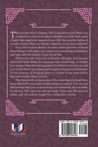 This is a true story of abuse. Did it happen to you? Were you violated as a child or an adult and held unto this dark secret of pain that negatively impacted your life? Are you the victim of a secret touch? Were you abused, rejected, or are you confused?If so, this book is about a woman, someone who endured those things. I will share my journey in overcoming molestation and rape and the impact it had on my life.This book will help you overcome the pain and trauma associated with abuse, for someone who needs help, or maybe you suspect that this has happened to a friend or loved one and you would like to encourage and support them moving forward. ItaEUR(tm)s my journey of bringing light to a corner of my heart where this had secretly taken its toll.This book will outline some of the ways that you may have been affected by any form of child abuse or neglect. You can use this book to help you overcome and move forward. Do not suffer in silence. Tell someone and get help. Turn your life around today, and you will no longer be a victim but a victor.