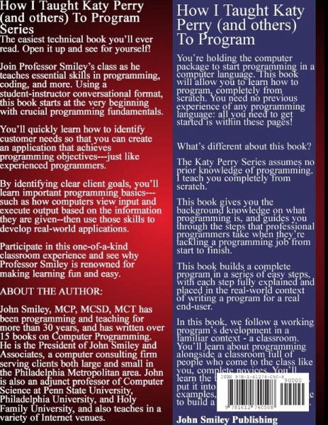 An Introductory text on Visual Basic using the freely downloadable Visual Basic 2010 Express Edition. The easiest technical book you'll ever read. Open it up and see for yourself. Join Professor Smiley's Visual Basic.Net class as he teaches essential skills in programming, coding and more. Using a student-instructor conversational format, this book starts at the very beginning with crucial programming fundamentals. You'll quickly learn how to identify customer needs so you can create an application that achieves programming objectives---just like experienced programmers. By identifying clear client goals, you'll learn important programming basics---like how computers view input and execute output based on the information they are given---then use those skills to develop real-world applications. Participate in this one-of-a-kind classroom experience and see why Professor Smiley is renowned for making learning fun and easy.