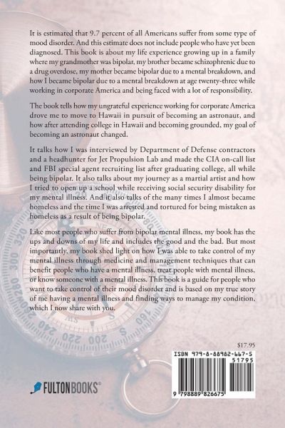 It is estimated that 9.7 percent of all Americans suffer from some type of mood disorder. And this estimate does not include people who have yet been diagnosed. This book is about my life experience growing up in a family where my grandmother was bipolar, my brother became schizophrenic due to a drug overdose, my mother became bipolar due to a mental breakdown, and how I became bipolar due to a mental breakdown at age twenty-three while working in corporate America and being faced with a lot of responsibility. The book tells how my ungrateful experience working for corporate America drove me to move to Hawaii in pursuit of becoming an astronaut, and how after attending college in Hawaii and becoming grounded, my goal of becoming an astronaut changed. It talks how I was interviewed by Department of Defense contractors and a headhunter for Jet Propulsion Lab and made the CIA on-call list and FBI special agent recruiting list after graduating college, all while being bipolar. It also talks about my journey as a martial artist and how I tried to open up a school while receiving social security disability for my mental illness. And it also talks of the many times I almost became homeless and the time I was arrested and tortured for being mistaken as homeless as a result of being bipolar. Like most people who suffer from bipolar mental illness, my book has the ups and downs of my life and includes the good and the bad. But most importantly, my book shed light on how I was able to take control of my mental illness through medicine and management techniques that can benefit people who have a mental illness, treat people with mental illness, or know someone with a mental illness. This book is a guide for people who want to take control of their mood disorder and is based on my true story of me having a mental illness and finding ways to manage my condition, which I now share with you.