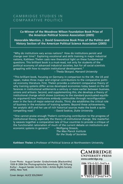 Kathleen Thelen explains the historical origins of important cross-national differences in four countries (Germany, Britain, the United States and Japan), and also provides a theory of institutional change over time. The latter is considered a frontier issue in institutionalist analysis, of which there are several varieties emerging from economics, political science, and sociology. Thelen's study contributes to the literature on the political economy of the developed democracies that focuses on different institutional arrangements defining distinctive models of capitalism.