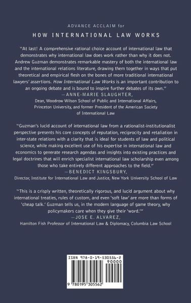 International relations are full of appeals to and claims about international law. From intellectual property, to human rights, to environment, to investment, to health and safety, issues that have traditionally been almost exclusively within the purview of domestic lawmakers are now the subject of international legal obligations. Yet despite the importance of international law, there are no well-developed set of theories on the ways in which international law impacts domestic decision makers. Filling a conspicuous gap in the legal literature, Andrew T. Guzman's How International Law Works develops a coherent theory of international law and applies that theory to the primary sources of law, treaties, customary international law, and soft law. Starting where most non-specialists start, Guzman looks at how a legal system without enforcement tools can succeed. If international law is not enforced through coercive tools, how is it enforced at all? And why would states comply with it?Supporting the traditional international law view that international law matters and affects state behavior, Guzman offers a theory of international law that assumes states behave rationally and selfishly. The author argues that at the heart of compliance with international law is the basic fact that a failure to live up to legal obligations today will impact a country's ability to extract concessions for legal promises in the future. Under this reputational model, the violation of international law generates a costly loss of reputation and the threat of this loss provides an incentive to comply. A reputational theory suggests when and where international law is likely to be effective and ways to maximize its ability to advance the goal of international cooperation. Understanding international law in a world of rational states helps us to understand when we can look to international law to resolve problems, and when we must accept that we live in an anarchic world and must leave some issues to politics.