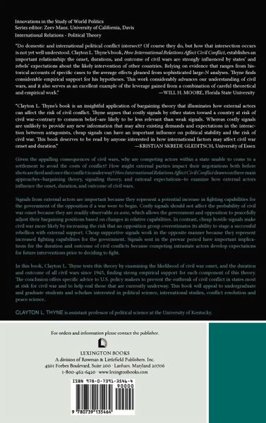 This book draws on bargaining theory, signaling theory, and rational expectations to better understand how 'signals' sent from external actors affect civil wars. Clayton L. Thyne combines quantitative analyses of over 150 civil wars with in-depth case studies to show how seemingly innocuous 'cheap' signals have an enormous impact on a state's stability, the duration of fighting once a war begins, and the ultimate victor of the conflict.