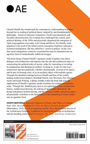 Chantal Mouffe has transformed the contemporary understanding of politics through her re-reading of political theory inspired by anti-foundationalist philosophy-based on Saussure's linguistics, Freud's psychoanalysis and Derrida's deconstruction. Her writings have challenged the centrist, post-political ideology of the 1990s and presciently diagnosed the emergence of right-wing populism seen today with Trump and Brexit. For Mouffe, such populism is the result of the failed centrist conception of politics reduced to technical management. She has called for a "return to politics" on the view that social antagonisms cannot be reconciled but must be channeled into an agonistic form of institutionally stabilized struggle. This book brings Chantal Mouffe's agonistic model of politics into direct dialogue with architecture and inquiries into the role that architecture plays constructing the political order of society, either by concealing or revealing its antagonisms and ideological conflicts. In doing so, it asks in what ways architecture operates politically; whether institutionally, in terms of its spaces and its part in forming cities, or as an aesthetic object with mediatic agency. Through this detailed exchange between Mouffe and four of the world's leading architectural thinkers; Reinhold Martin, Ines Weisman, Pier Vittorio Aureli and Sarah Whiting, a debate unfolds within the book that tests the implications of Mouffe's agonistic model of politics for architectural practice today. Through this, Bedford explores how architectural history, architectural drawing, the making of spectacular monuments, the design and policies behind housing, and the making of public and private space, all potentially contribute to the formulation of the channeling of social conflict into an agonistic form.