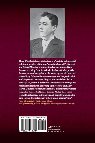'King' O'Malley is known to history as a 'larrikin' and maverick politician, member of the first Australian Federal Parliament and Federal Minister, whose political career spanned two decades. Arriving from America in the late 1880s he quickly drew attention through his public shenanigans; his theatrical storytelling, fashionable accoutrements, and 'larger than life' Yankee persona. However, his past remained shrouded in mystery. Yet, on the other side of the Pacific another mystery remained unresolved. Following the notorious 1882 New Haven, Connecticut, trial and acquittal of James Malley, main suspect in the death of Jennie Cramer, Malley disappears from official records in the north east United States, and the saga begins. This is the story of how James became 'King'.