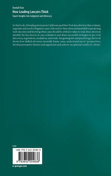 "In How Leading Lawyers Think, Kiser moves from the analysis of large bodies of data to close analysis of a group of select lawyers chosen for their ability to beat the odds and make accurate case assessments and good settlements or good decisions to instead try the cases. He examines their habits of mind and approach to their clients, cases, colleagues and opposition in an effort to isolate practices that can assist all of us as advocates and mediators to calibrate our own case assessments and to understand the importance of certain criteria and disciplines in predicting case outcomes. The body of Kiser's work is really a must for anyone who seeks an improved understanding of good judgment and impediments to good judgment generally and in the more specific context of case assessment." (Laura A. Kaster, New York Dispute Resolution Lawyer, Spring 2012, Vol. 5, No. 1, pp. 79-80)