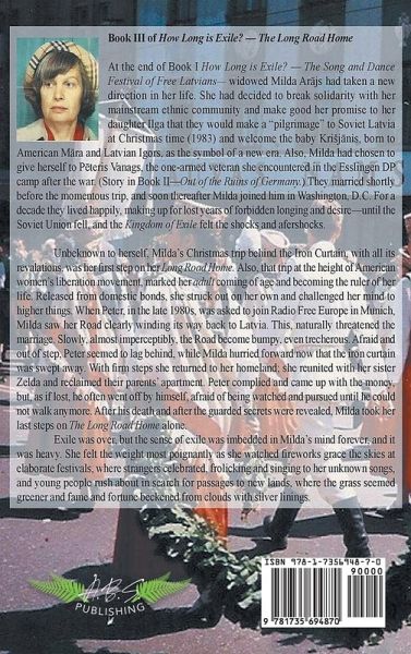 At the end of Book I How Long is Exile? The Song and Dance Festival of Free Latvians, widowed Milda Arajs had taken a new direction in her life. She had decided to break solidarity with her mainstream ethnic community and make good her promise to her daughter Ilga that they would make a "pilgrimage" to Soviet Latvia at Christmas time (1983) and welcome the baby Krijanis, born to American Mara and Latvian Igors, as the symbol of a new era. Also, Milda had chosen to give herself to Peteris Vanags, the one-armed veteran she encountered in the Esslingen DP camp after the war. (Story in Book II: Out of the Ruins of Germany.) They married shortly before the momentous trip, and soon thereafter Milda joined him in Washington, D.C. For a decade they lived happily, making up for lost years of forbidden longing and desire until the Soviet Union fell, and the Kingdom of Exile felt the shocks and aftershocks. Unbeknown to herself, Milda's Christmas trip behind the Iron Curtain, with all its revalations, was her first step on her Long Road Home. Also, that trip at the height of American women's liberation movement, marked her adult coming of age and becoming the ruler of her life. Released from domestic bonds, she struck out on her own and challenged her mind to higher things. When Peter, in the late 1980s, was asked to join Radio Free Europe in Munich, Milda saw her Road clearly winding its way back to Latvia. This, naturally threatened the marriage. Slowly, almost imperceptibly, the Road become bumpy, even trecherous. Afraid and out of step, Peter seemed to lag behind, while Milda hurried forward now that the iron curtain was swept away. With firm steps she returned to her homeland; she reunited with her sister Zelda and reclaimed their parents' apartment. Peter complied and came up with the money, but, as if lost, he often went off by himself, afraid of being watched and pursued until he could not walk anymore. After his death and after the guarded secrets were revealed, Milda took her last steps on The Long Road Home alone. Exile was over, but the sense of exile was imbedded in Milda's mind forever, and it was heavy. She felt the weight most poignantly as she watched fireworks grace the skies at elaborate festivals, where strangers celebrated, frolicking and singing to her unknown songs, and young people rush about in search for passages to new lands, where the grass seemed greener and fame and fortune beckened from clouds with silver linings. As a participant in that, so called Exile State, I began writing my version of the experience after the Milwaukee festival, filtering it through the consciousness of my main character Milda Berzi¿a-Arajs, who, coming out of mourning for her husband Karlis Arajs, arrives at the festival, ready to turn a new leaf in her life. During the four days with like-minded people, interesting events, and common recollections of her childhood, the war and post-war experiences in a displaced persons' camp flash before her in a swirling kaleidescope and, at the end, throws her in the direction she did not plan to go. Book III captures the mood after the fall of the USSR. The ethnic communities the Kingdom of Exile is shaken, and the people awake as if from a deep sleep. Milda suddenly becomes active; she makes crucial decisions and switches from an outdated romantic into a realist as she returns home, meets her estranged sister and the country she had left behind. As she tries to find her place in it, she understands that exile is a state of mind; it is a state where half the world's population lives like she uprooted by tyranny and wars. Yet she and other displaced persons go on living and finding pleasure in art, poetry, song, and in each other, though with a sad, melancholy smile.