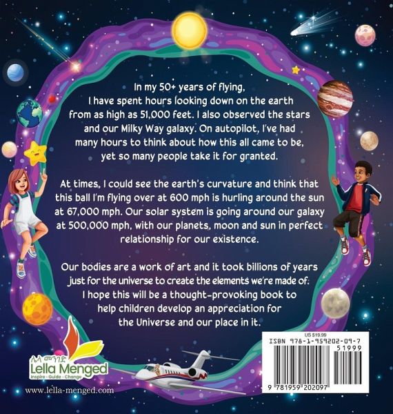 In my 50+ years of flying, I have spent hours looking down on the earth from as high as 51,000 feet. I also observed the stars and our Milky Way galaxy. On autopilot, I've had many hours to think about how this all came to be, yet so many people take it for granted. At times, I could see the earth's curvature and think that this ball I'm flying over at 600 mph is hurling around the sun at 67,000 mph. Our solar system is going around our galaxy at 500,000 mph, with our planets, moon and sun in perfect relationship for our existence. Our bodies are a work of art and it took billions of years just for the universe to create the elements we're made of. I hope this will be a thought-provoking book to help children develop an appreciation for the Universe and our place in it.