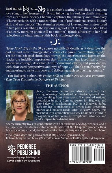 How Much Big Is the Sky is a mother's searingly melodic and eloquent love song to her teenage son, Ryan, following his sudden death resulting from a car crash. Sherry Chapman captures the intimacy and immediacy of her experience with a rare combination of profound tenderness, literary skill, and raw candor. This stunning account of love and loss is structured in five parts resembling the various stages of grief. From the sudden blow of an early morning phone call to a mother's frantic advocacy to her final reflections on what remains, this book is unforgettable.
