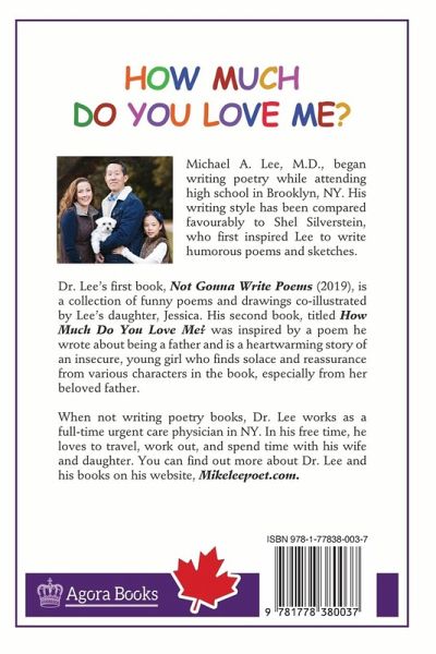 Michael A. Lee, M.D., began writing poetry while attending high school in Brooklyn, NY. His writing style has been compared favourably to Shel Silverstein, who first inspired Lee to write humorous poems and sketches. Dr. Lee's first book, Not Gonna Write Poems (2019), is a collection of funny poems and drawings co-illustrated by Lee's daughter, Jessica. His second book, titled How Much Do You Love Me? was inspired by a poem he wrote about being a father and is a heartwarming story of an insecure, young girl who finds solace and reassurance from various characters in the book, especially from…mehr