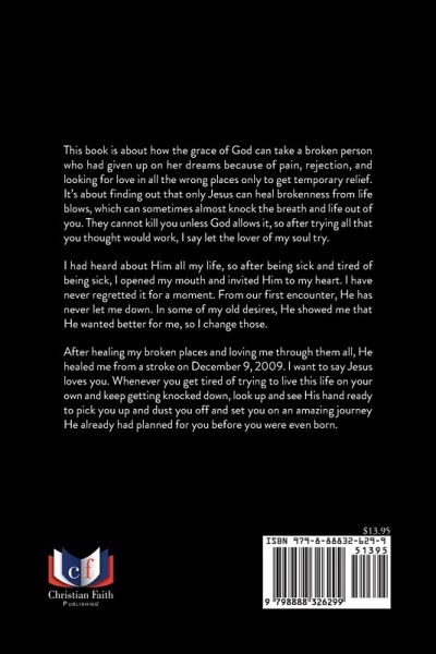 [Type text] t [Type text] t This book is about how the grace of God can take a broken person who had given up on her dreams because of pain, rejection, and looking for love in all the wrong places only to get temporary relief. It's about finding out that only Jesus can heal brokenness from life blows, which can sometimes almost knock the breath and life out of you. They cannot kill you unless God allows it, so after trying all that you thought would work, I say let the lover of my soul try. I had heard about Him all my life, so after being sick and tired of being sick, I opened my mouth and invited Him to my heart. I have never regretted it for a moment. From our first encounter, He has never let me down. In some of my old desires, He showed me that He wanted better for me, so I change those. After healing my broken places and loving me through them all, He healed me from a stroke on December 9, 2009. I want to say Jesus loves you. Whenever you get tired of trying to live this life on your own and keep getting knocked down, look up and see His hand ready to pick you up and dust you off and set you on an amazing journey He already had planned for you before you were even born.