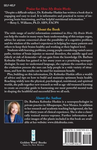 The wide range of useful information contained in How My Brain Works can help the reader in many ways: basic understanding of this unique organ, advice for anyone concerned about the possibility of a cognitive problem, and the wisdom of the author's experience in helping her many patients and others to keep their brains healthy and working at their highest level. Students with learning problems, young people considering varied career paths, victims of brain injuries or mental disorders, the middle-aged and elderly at risk of dementia-all can gain from the knowledge Dr. Barbara Koltuska-Haskin has gained in her many years as a practicing neuropsychologist. In easy-to-understand language, she explains the countless ways the evaluation process she uses can help people in a wide variety of situations, and how the results can be used for maximum benefit. Plus, building on this information, Dr. Koltuska-Haskin offers a wealth of advice and tips on how to build and maintain optimum brain health. Reaching widely into the physical, psychological, nutritional, and spiritual worlds, she pulls together new research as well as age-old treasured learning to create an everyday guide to harnessing our most powerful mental tools in shaping the healthful and successful lives we all seek.