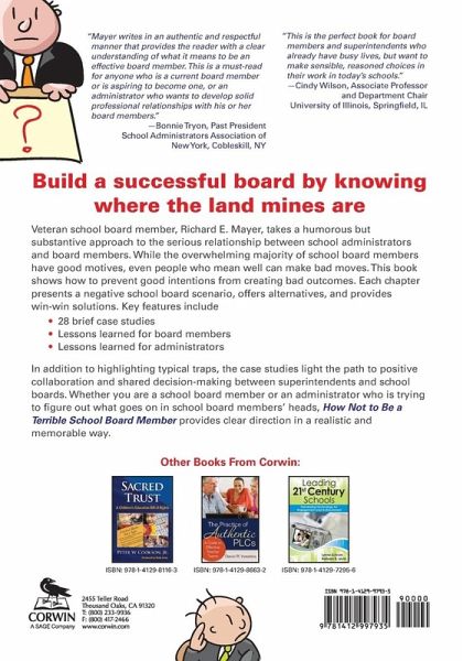 How to Not Be a Terrible School Board Member is a practical guide both for how to become an effective school board member, and for how school administrators can improve their board relations. The intended audience is prospective, present, and past school board members and school administrators.While the overwhelming majority of school board members have good motives, even people with good motives can make bad moves, even terrible moves. This book is dedicated to preventing situations in which good intentions can lead to bad outcomes. The book takes a case based approach that focuses on terrible school board member moves as the fastest and most memorable way to help one learn how to be an effective school board member ,and to see, by contrast, how a successful school board member operates. Case-based learning is used in many professional programs such as business, law, medicine, and even teacher education, and research on learning by example has a strong and growing empirical research base.