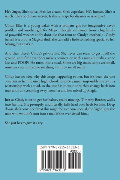 He's Sugar. She's spice. He's ice cream. She's cupcakes. He's human. She's a witch. They both have secrets. Is this a recipe for disaster or true love? Cindy Eller is a young baker with a brilliant gift for imaginative flavor profiles, and another gift for Magic. Though she comes from a big family of powerful witches (only don't use that term to Cindy's mother!) , Cindy herself is a bit of a Magical dud. She can add a little something special to her baking, but that's it. And then there's Cindy's private life. She never can seem to get it off the ground, and if she ever does make a connection with a man all it takes is one kiss and POOF! He turns into a toad. Some are big toads, some are small, some are cute, and some are slimy, but they are all toads. Cindy has no idea why this keeps happening to her, but it's been the one constant in her life since high school. It's pretty much impossible to stay in a relationship with a toad, so she just has to wait until they change back into men and run screaming away from her and her mixed up Magic. Just as Cindy is set to get her bakery really moving, Timothy Borden walks into her life. She promptly, and literally, falls head over heels for him. Deep down, she's convinced that this might be someone special, the "right" guy, the man who wouldn't turn into a toad if she ever kissed him... She just has to give it a try.