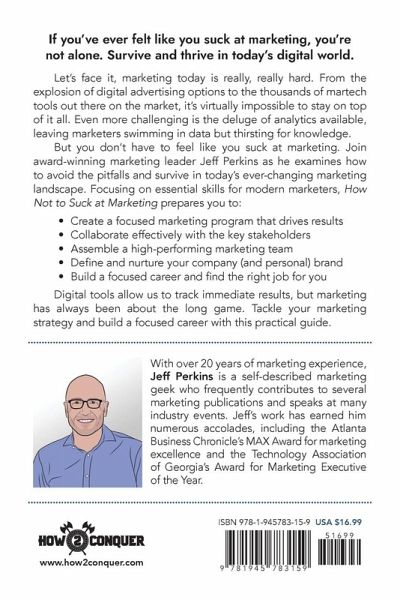 Let's face it, marketing today is really, really hard. From the explosion of digital advertising options to the thousands of martech tools out there on the market, it's virtually impossible to stay on top of it all. Even more challenging is the deluge of analytics available, leaving marketers swimming in data but thirsting for knowledge. But you don't have to feel like you suck at marketing. Join award-winning marketing leader Jeff Perkins as he examines how to avoid the pitfalls and survive in today's ever-changing marketing landscape. Focusing on essential skills for modern marketers, How Not to Suck at Marketing prepares you to: Create a focused marketing program that drives results Collaborate effectively with the key stakeholders Assemble a high-performing marketing team Define and nurture your company (and personal) brand Build a focused career and find the right job for you Digital tools allow us to track immediate results, but marketing has always been about the long game. Tackle your marketing strategy and build a focused career with this practical guide.