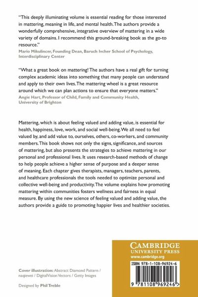 Mattering, which is about feeling valued and adding value, is essential to our health, happiness, relationships, work, and society. Mattering improves both wellness and fairness in society. People interested in improving their personal wellbeing as well as the well-being of others will benefit from this book's research-based strategies.