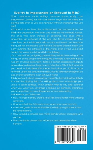 Ever try to impersonate an Extrovert to fit in? Can’t over come social settings because you’re easily over shadowed? Looking for the completive edge that will make the playing field even so you can standout without changing who you are? All around us we hear the achievement and success from two thirds the population. The other one third are the unheard voices. The ones who listen instead of speaking. The ones whose innovations go unheard of. The one who favor working on their own. They are the introverts with a voice not heard. Just because the quiet has enveloped you into the shadows doesn't mean you can't outshine the Extroverts of the world. Even if your voice isn't heard, the value you bring will do the talking. It’s no secret loud, outgoing, personable people have a leg up on the quiet. Some people are energized by others. And while there’s no right or wrong personality, there is a certain imbalance that puts introverts at a disadvantage in many situations. What that means is you need to find alternative means that allow you to fit in as an introvert. Learn the queues that allow you to take advantage of an opportunity and thrive in an Extrovert world. This book is not about reinventing yourself but providing the skillsets to even the playing field. I'm talking about how to leverage your voice in social settings. Know exactly what to say and connect when you want too. Leverage charisma on demand. Dominate your competitors as an entrepreneur or in a sales setting. Furthermore, you'll discover: How to single handily create small talk and chatter without being awkward. How to outsell the Extroverts even when your quiet and shy. A survival guide for social situations to help you get known and be remembered. How to build a network and make friends without changing who you are. The one simple phrase that influence and persuades when nervous. If you’re tired of being dealt losing hands for being yourself, then this book is for you. My goal is to teach you strategies that only internally focused people can use. Strategies that will put you ahead of even your most extroverted counterparts. If that’s what you need don’t waste another second. Get your copy now and take charge of your life!