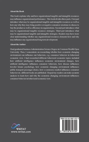 This book explains why and how organizational tangible and intangible resources may influence organizational performance . This book divides three parts. First part introduce what may be organizational tangible and intangible resources as well as how any why they may bring positive or negative consumer emotions to choose to buy the product as well as efficiency in organizations. Second part introduces what may be organizational tangible resources strategies. Third part introduces what may be organizational tangible and intangible strategies. Readers may have more clear understanding whether any organizational resources elements how and why may influence any organizational long term development.